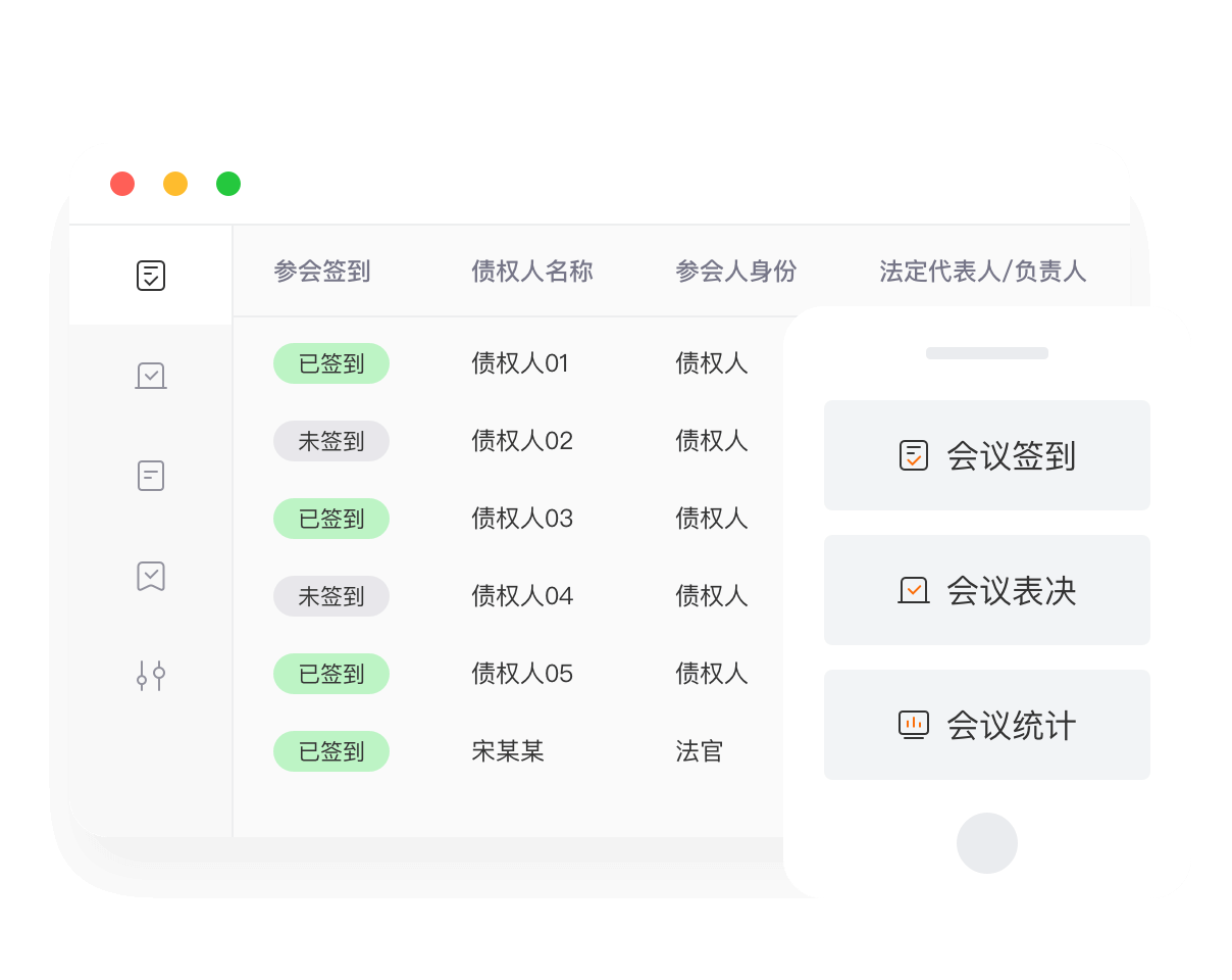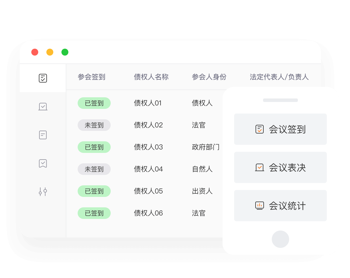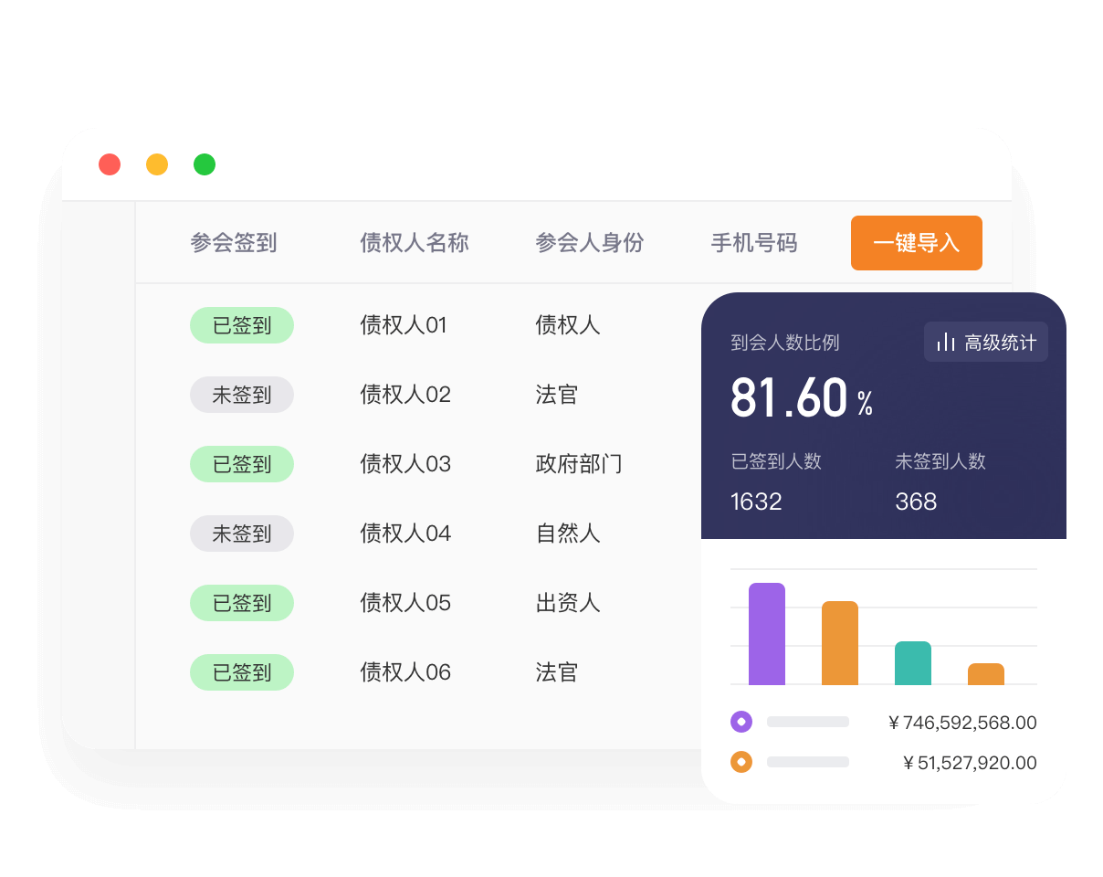 参会数据同步统计、表决数据自动计算、表决结果实时可得;签到、表决等关键事项人脸识别安全验证;支持管理人和债权人实时互动
